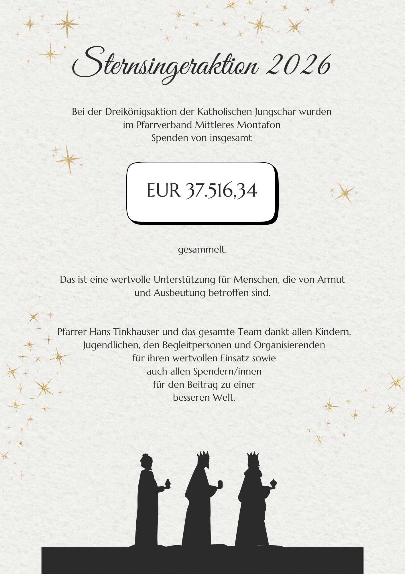 Im Pfarrverband Mittleres Montafon wurden Spenden von insgesamt EUR 37.516,34 gesammelt. Mit diesen Spenden der Dreikönigsaktion der Katholischen Jungschar werden Projekte des Globalen Süden unterstützt.