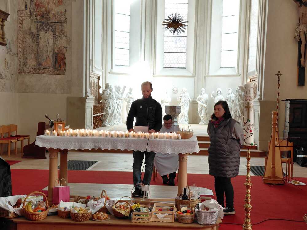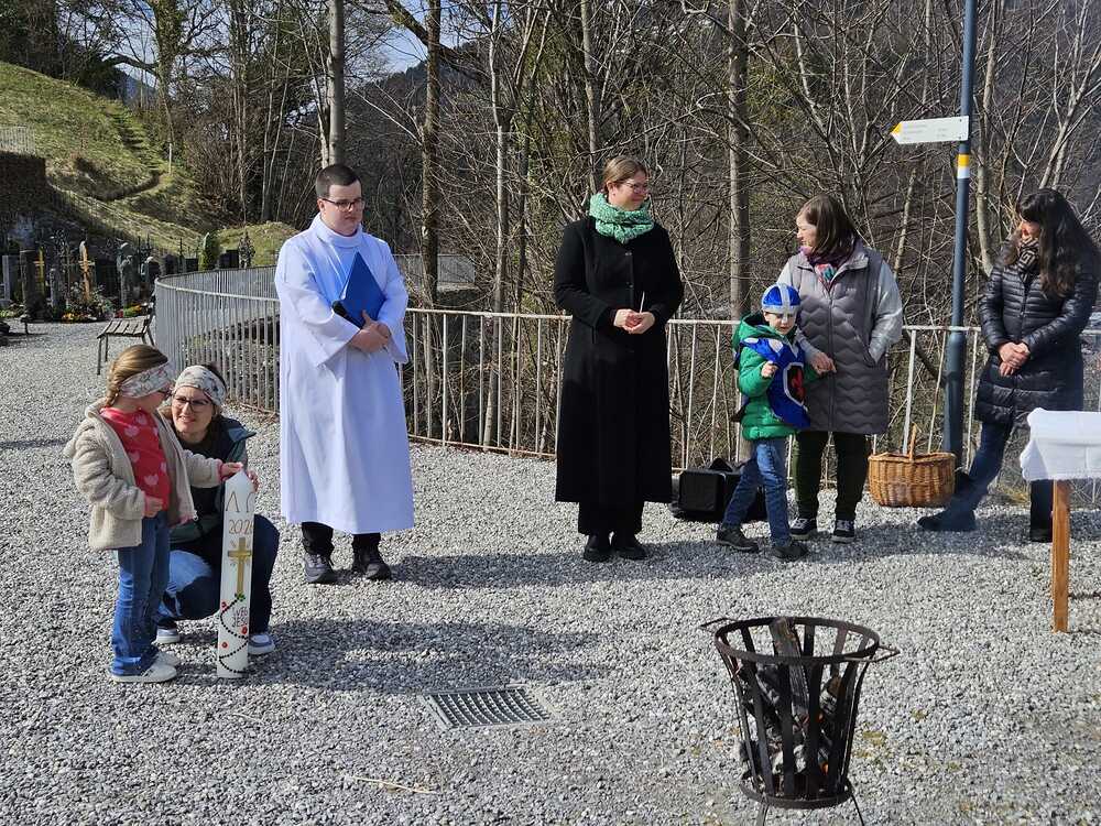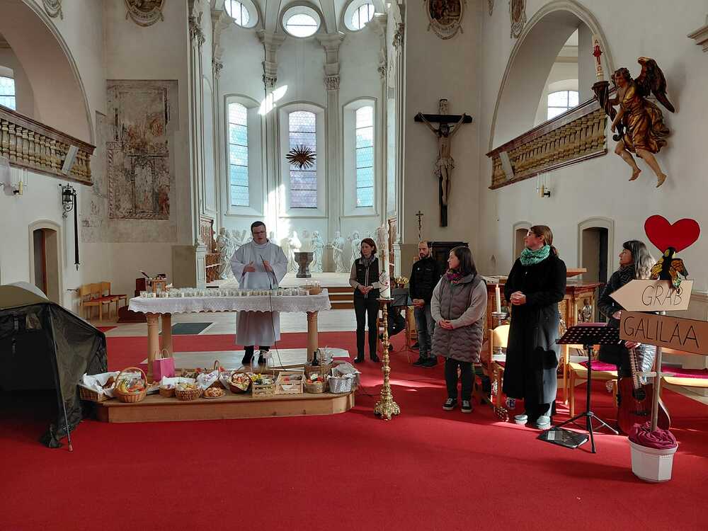 Am Tag der Grabesruhe (Karsamstag) wurden zu Mittag die Osterspeisen gesegnet. Der Einladung zur Osterlichtfeier in der Wallfahrtskirche in Tschagguns sind viele Familien gefolgt und konnten die Auferstehung Jesu Christi spielerisch nacherzählt miterleben.