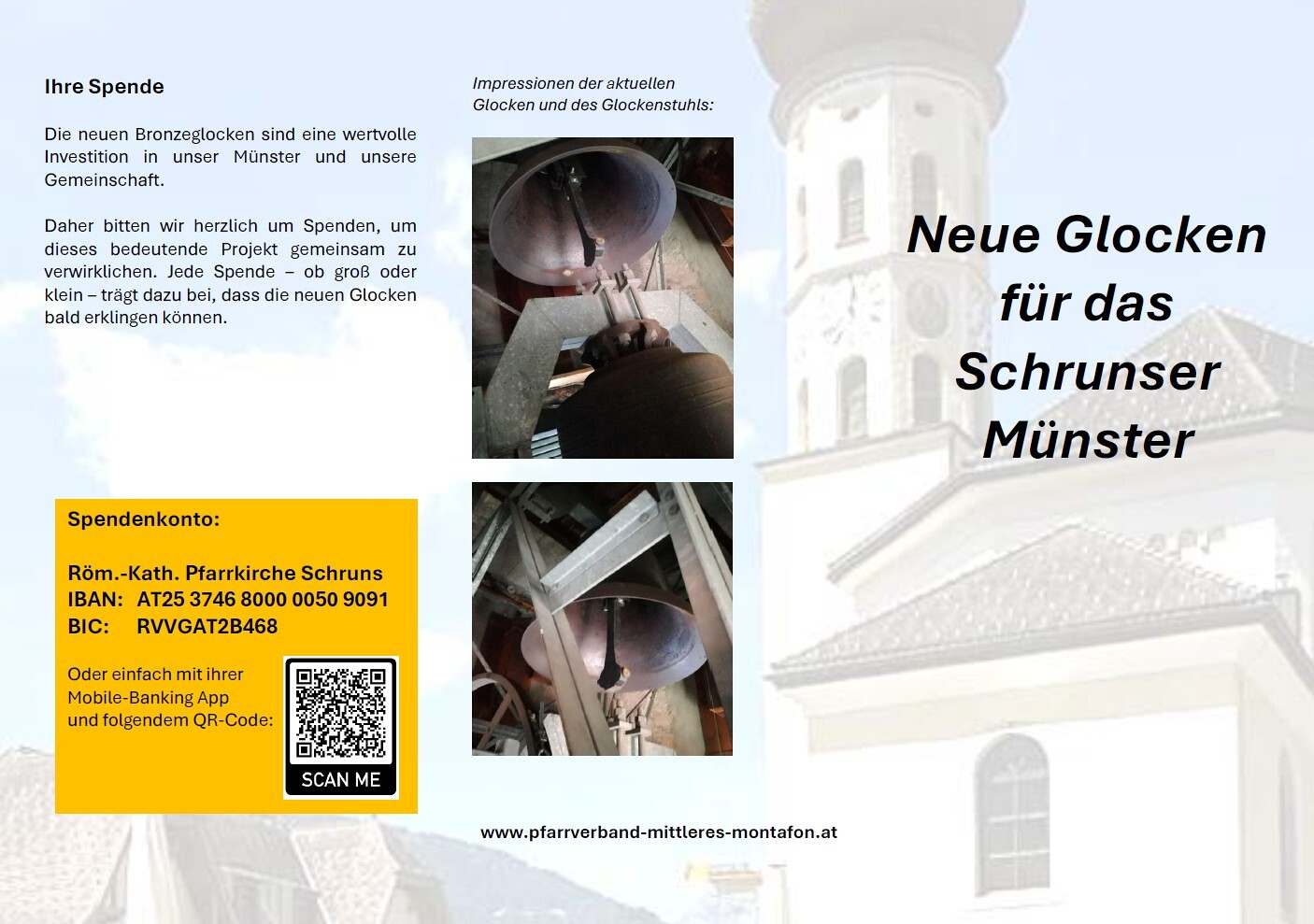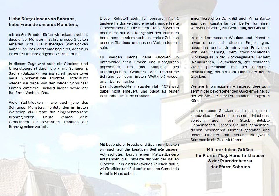 Unser Gotteshaus, mit dem wohl größten pfeilerlosen Kirchenraum Vorarlbergs, kann auf eine lange, abwechslungsreiche Geschichte zurückblicken. Ursprünglich gehörten die Bewohner des Tales zur Pfarre Bartholomäberg, der ältesten im Montafon. In einem Zinslibell der Bludenzer Laurentiuskirche wird erstmals 1433 ein St. Jossen Gotteshaus im Pfarrbezirk Bartholomäberg erwähnt und in einer Urkunde von 1490 lesen wir von „St. Josen, gnadenreich in der Kapelle zu Schruns im Montafon“.